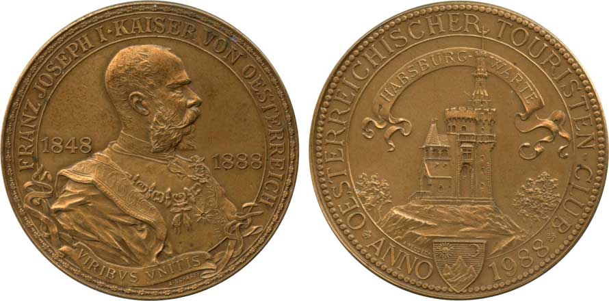 | 333. | Scharff A., Neudeck A. – Na 40. výročí vlády a na 100. výročí postavení rozhledny. – Poprsí císaře vpravo 1848–1888 / rozhledna dělí nápis „Habsburg–Warte", pod ní znak klubu, opis. – Bronz, 36 mm. | 0/0 | 400,- | 4000,- |
