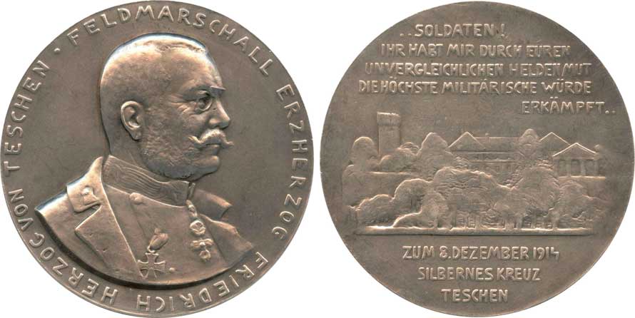 | 335. | Friedrich von Österreich-Teschen /Arcivévoda a polní maršál, poslední kníže Těšínský/ 1856–1936. – Scholz H. – Poprsí vpravo / těšínský zámek, 8. XII. 1914. – Ag, punc, 56 mm, 68,99 g, Hauser–577 | 0/0 | 4500,- | --.- |