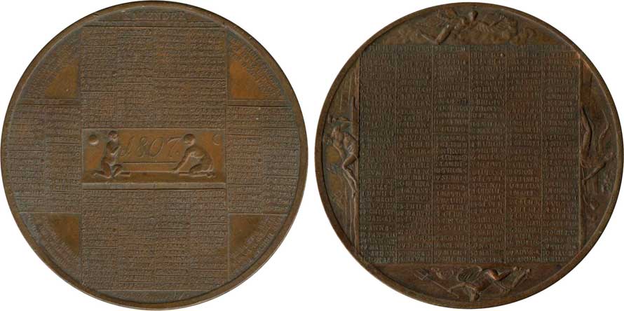 | 1416. | Kalendářní medaile na rok 1805. – 3 ř. nápis, slunce a měsíc, kalendářní tabulky / kalendářní tabulky a znamení zvěrokruhu. – Cu, 49 mm, pěkná patina. | 0/0 | 800,- | 1100,- |