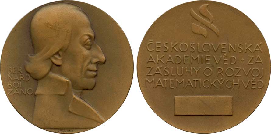 | 1512. | Straka J. V., 1966. – ČSAV, udělovací medaile. – Za zásluhy o rozvoj matematických věd. – Poprsí Bernarda Bolzana vpravo / 4 ř. nápis. – Bronz, 65 mm. | 0/0 | 200,- | --.- |