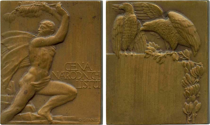 | 1530. | Španiel O., 1910. – Cena Národních listů, neudělená. – Vítěz s vavřínovou ratolestí vpravo, 3 ř. nápis / dva sedící sokoli, vavřínová snítka. – Bronz, 33 x 40 mm, „R“. | 0/0 | 300,- | 700,- |