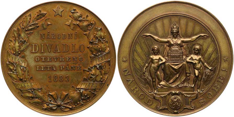 | 1407. | Schnirch B., 1883. – Otevření Národního divadla – 5 ř. náp. v lípovém a vavř. věnci / personifikace Prahy s modelem ND čelně, po bocích putti, český lev, opis „NÁROD SOBĚ". – Bronz, 60 mm, původní etue. | 0/0 | 500,- | 800,- |