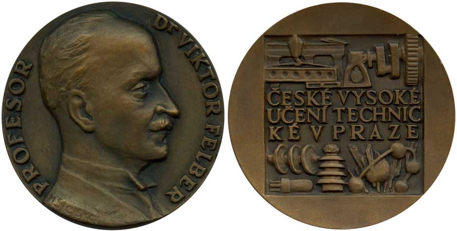 | 1425. | Stejskal M. – Prof. Dr. Viktor Felber. – Poprsí vpravo / strojní součásti, uprostřed 3 ř. nápis „ČESKÉ VYSOKÉ UČENÍ TECHNICKÉ V PRAZE". – masivní bronz, 80 mm, síla 12 mm. | 0/0 | 400,- | --.- |
