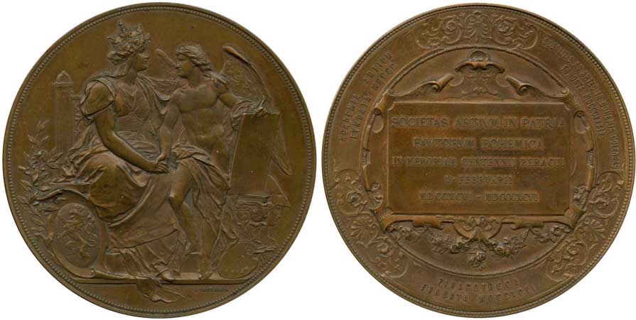 | 1459. | Tautenhayn J., 1896. – Společnost vlasteneckých přátel umění v Čechách. – Sedící Čechie a Genius malířství / 5 ř. nápis v ozdobné kartuši, opisy. – Bronz, 80 mm, Hauser-1784, „RR“ | 0/0 | 8000,- | --.- |