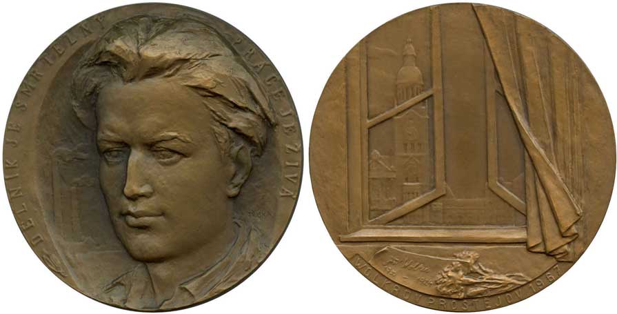 | 1401. | Prádler J. 1972. – J. Vrchlický. – Portrét čelně, vroč. 1853–1912 / Památník nár. písemnictví v Praze, lev. – Bronz, 35 a 60 mm, 2 ks. | 0/0 | 160,- | 160,- |