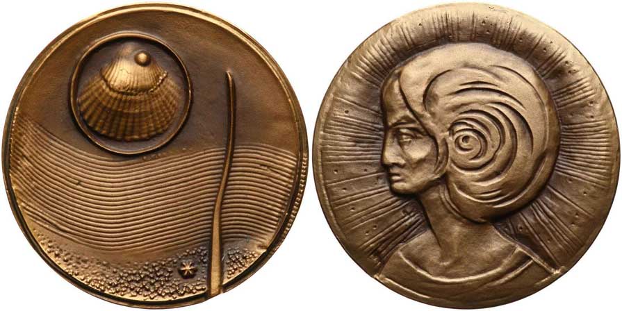 | 1487. | Wagner L., 1974. – Dante, „Nový život". – Portrét vlevo / mušle, moře. – Masivní, částečně zlacený bronz, 60 mm. | 0/0 | 100,- | 100,- |