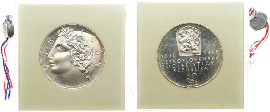 | 522. | 50 Kčs 1968 /50. výr. vzniku Československa a 20. výr. vítězství pracujícího lidu/, původní čtvercová etue s olověnou plombou, „R“. | PROOF | 12000,- | 12000,- |