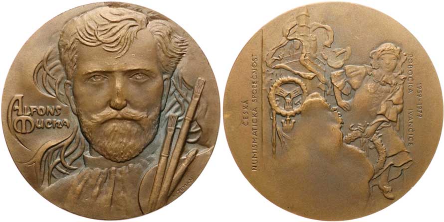 | 1257. | ČNS, pobočka Ivančice. – Zeman K., 1979. – 20 let pobočky. – Portrét Alfonse Muchy čelně, štětce / motiv z Muchova plakátu. – Bronz 60 mm, BK-17/4, ZK-23. | 0/0 | 400,- | 600,- |