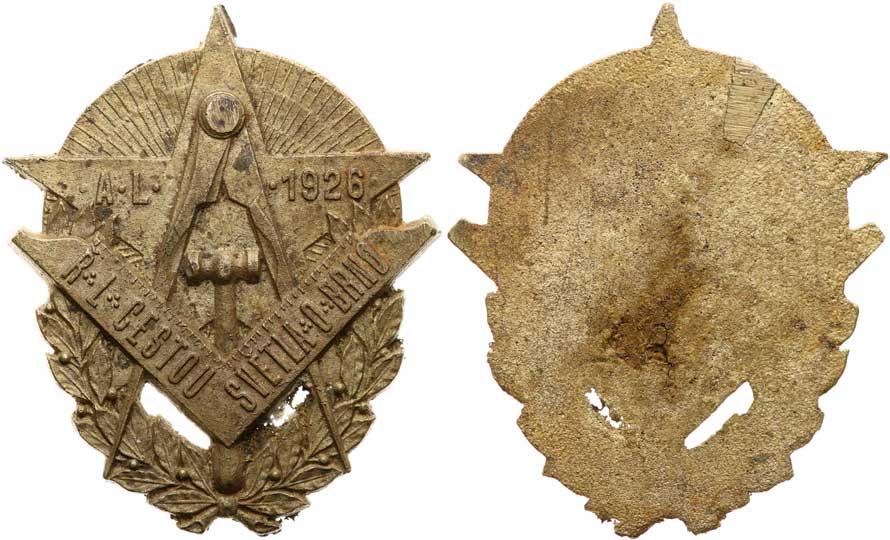 | 1573. | Zednářská lóže Cestou Světla Orient Brno, zal. 1926. – Litý bronz, 55 x 68 mm, jednostr., patina, skvrnky. | 1 | 500,- | 2600,- |