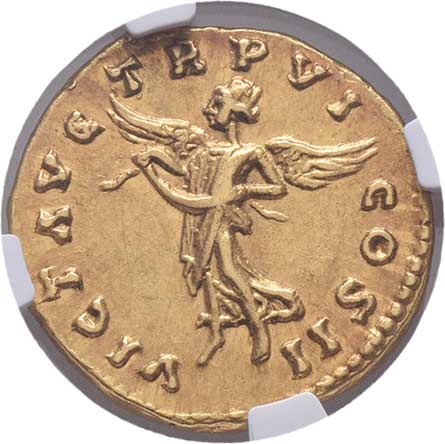 | 5. | Aureus, Rv:"COS.IIII.", Felicitas drží kozoroha a