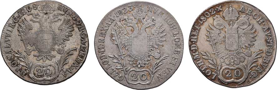 | 1416. | 20 Krejcar 1802 C, 1808 C, 1823 C, Praha, 6.451g,