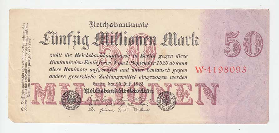 | 3554. | 50 Mio Marek 25.7.1923, Pick.98a, Ros.97a - série W | 3+ | 12,- | 16,- |