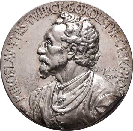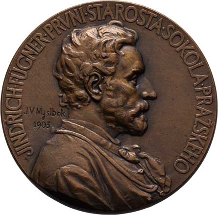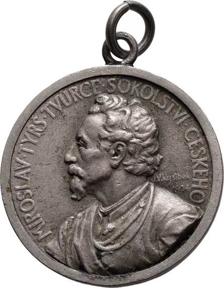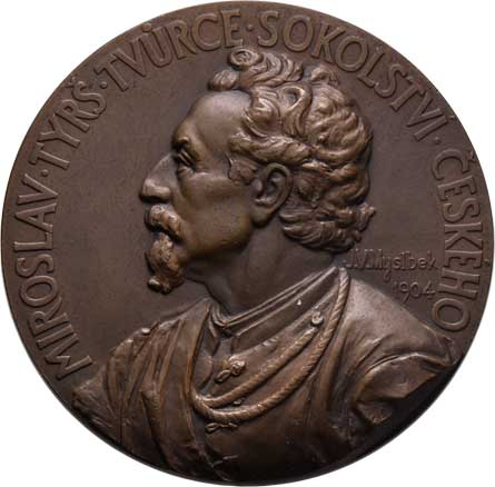 dvojportrét Fügnera a Tyrše, písmo / sokol sedící na větvi, vročení, opis, Sign., patinovaný bronz 60 mm |