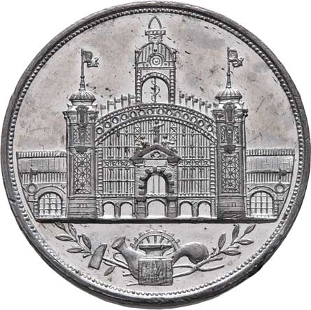 Čechie, opis / Průmyslový palác, atributy, Sign., cín 38mm bez ouška, ŠFP.28d, dr.hr., nep.rysky, skvrnky |