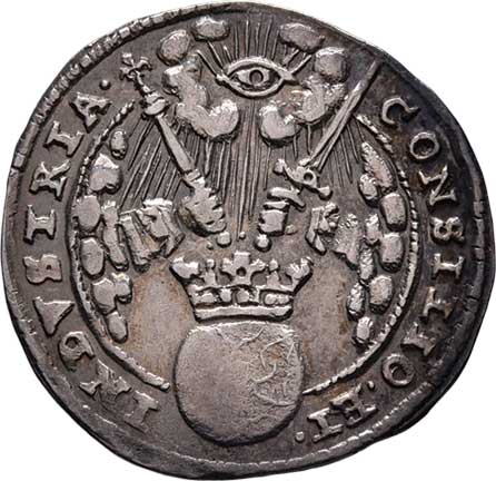 Boží oko, ruce s mečem a žezlem nad zeměkoulí, opis / 6-řádk.nápis, Ag 23mm, 2.846g, Nov.E.12a, exc., pat. |