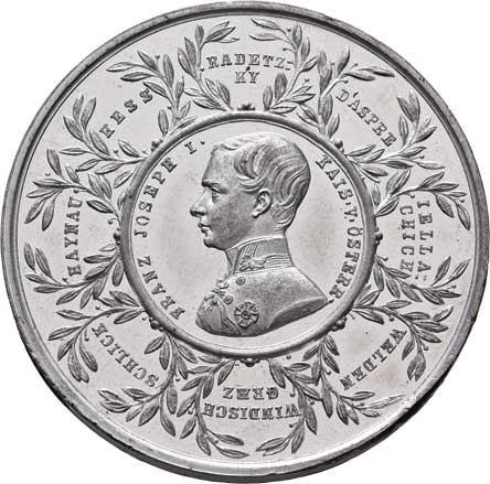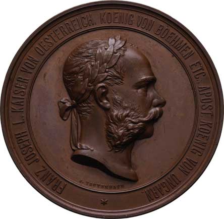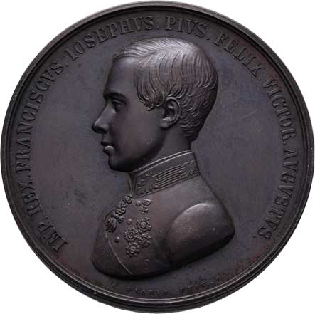 poprsí císaře zleva, opis /slavnostní scéna v Terstu, opis a nápis, Sign., bronz 58 mm, H.3751(Ag), patina |