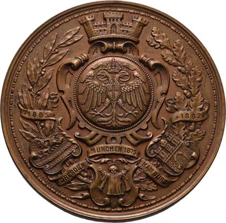 alegorie a opis / čtyři znaky pod hradební korunou, věnec, Sign., bronz 60mm, 87.565g, Bach.172, patina |