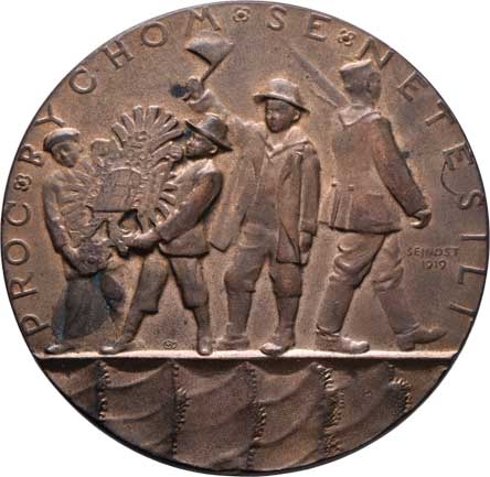 nesoucí stržený císařský znak, opis/ zářící znak ČSR, postavy, nápis, Sign., patin.bronz 50mm, 282ks, pat. |