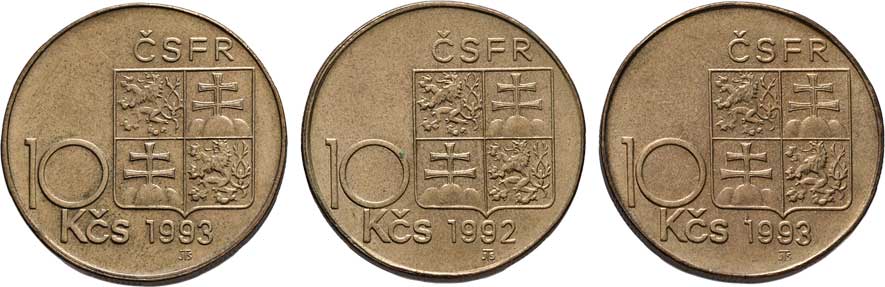 stojny M), 10 Kčs 1991 - M.R.Štefánik, 10 Kčs 1992 - A.Rašín, 8.000g, 7.974g, 8.052g, nep.rysky, pat. 3ks |