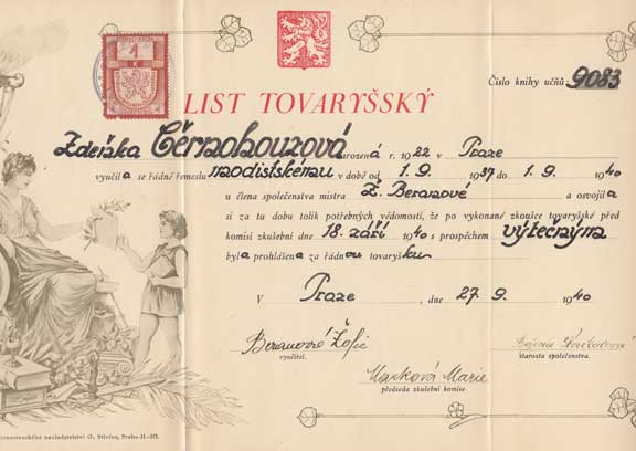 | 3812. | Praha 1940 - Zdeňka Černohouzová - tovaryšský list