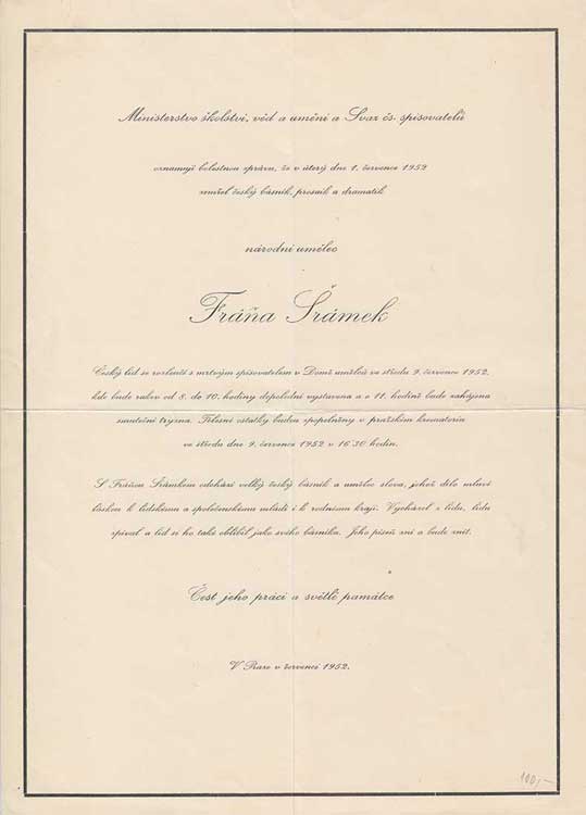 | 3818. | Fráňa Šrámek - 1.července 1952, 2x přeložené, velmi