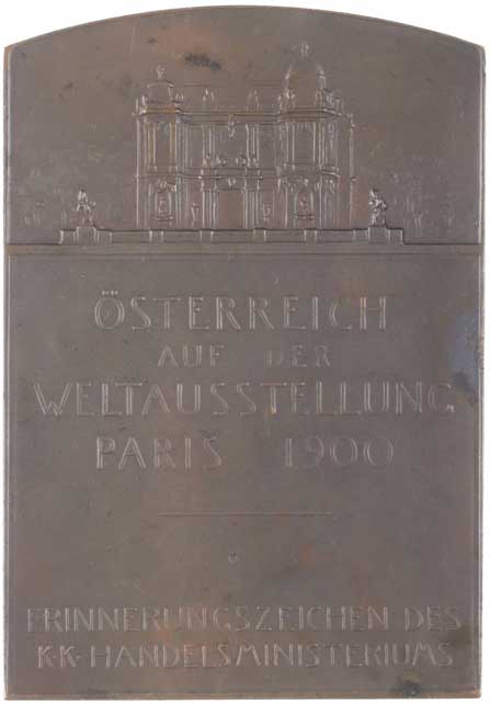 Personifikace Austrie Viribus Unitis / 6řádk.nápis pod výstavním palácem, Sign., Bronz.plaketa 52x75 mm |