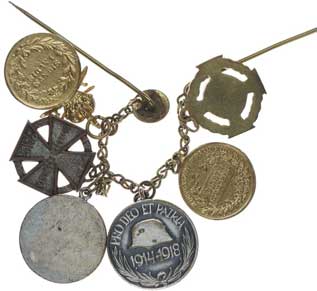 Medaile za zranění, Maď.med. na válku 1914-18, Občanská jub.pam.med.1898, Jub.kříž z r.1908 celk.6 ks na společném řetízku |