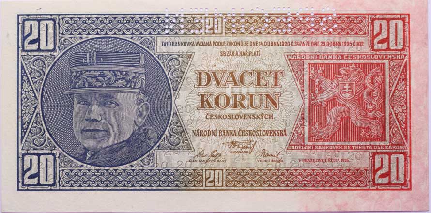 | 1090. | 20 Kč 1926, série Me, B.21b2, Hejz.21c2S1 "SPECIMEN" | N | 280,- | 420,- |