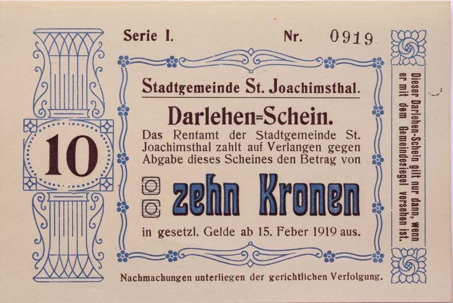 | 1117. | Jáchymov (St.Joachimsthal) město - 10 K. b.l. (1919), sér.I, č.0919