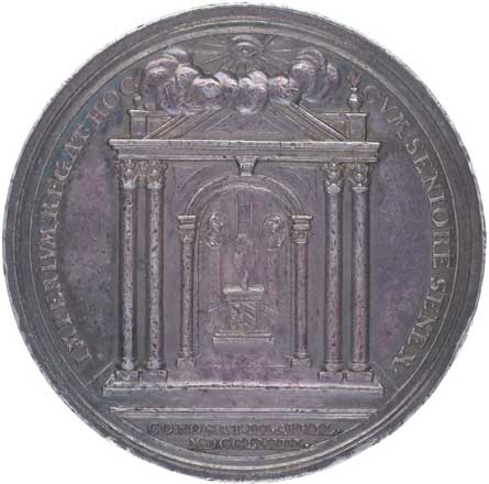 Hlava zprava, opis / průčelí kostela, vročení, opis, Sign.W.SEIDAN F., Bronz 43 mm, Don.3519, Mar.17/3 dr.hry v av. |