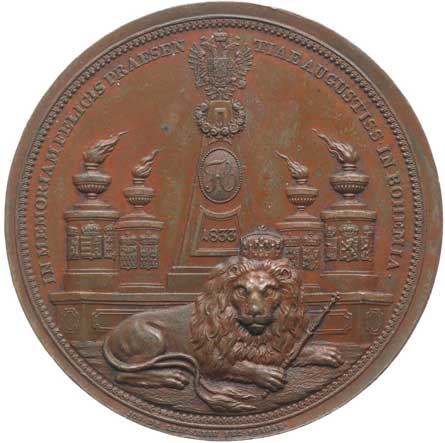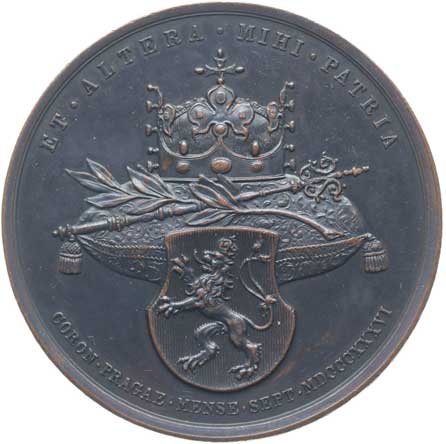 Poprsí čelně, 5řádk.nápis / čtyři vročení, korunovaný knížecí znak Sign., Bronz.plaketa 46x56 mm |
