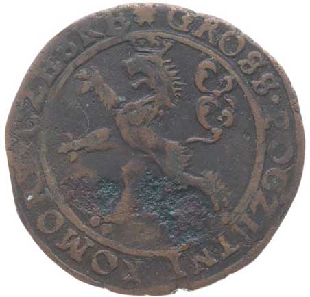 | 579. | Početní groš měděný b.l., český lev drží tři razidla, opis / český