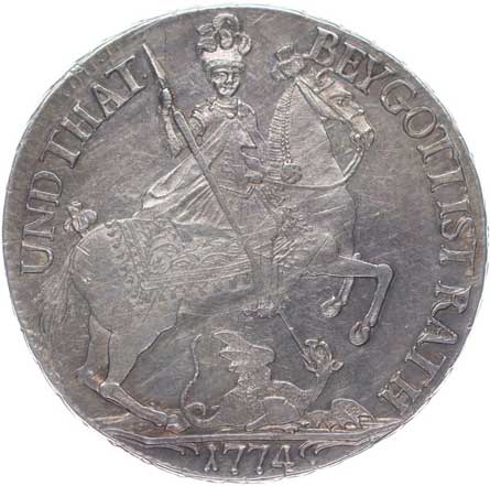 | 581. | 1/2 Tolar 1774, korunovaný znak, opis / svatý Jiří zabíjí draka