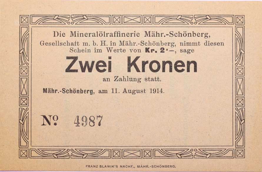 | 3415. | Šumperk (M.Schönberg), mineral.raf., 2 Krone 11.8.1914, No.4987,