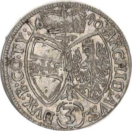 | 682. | 3 kr. 1697 IA, Štýrsko-Aigmann var.: LEOPOLDUS.D:G:R:I:S:A:()
