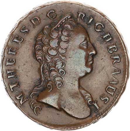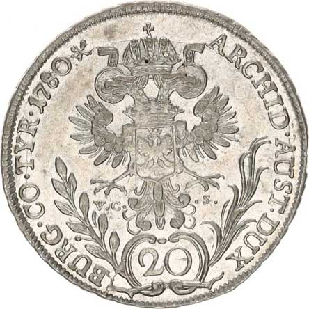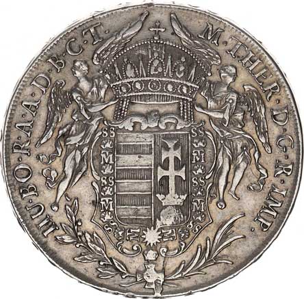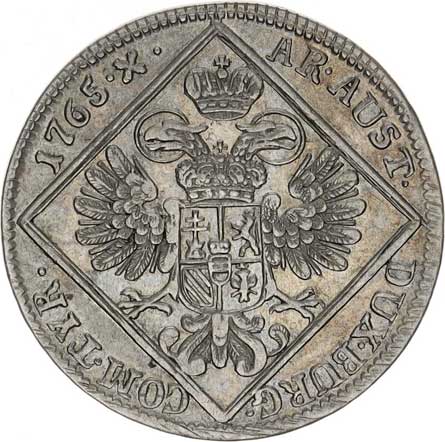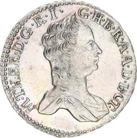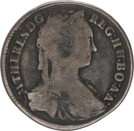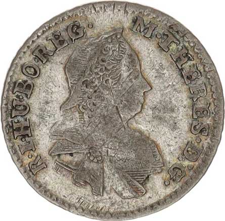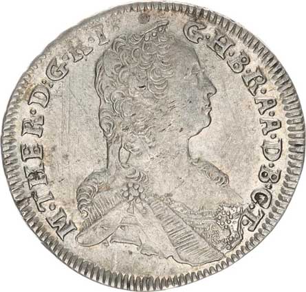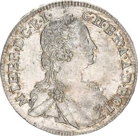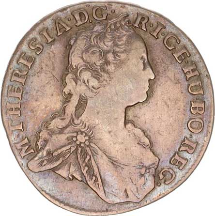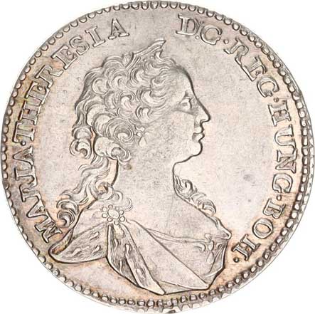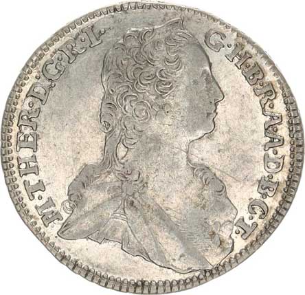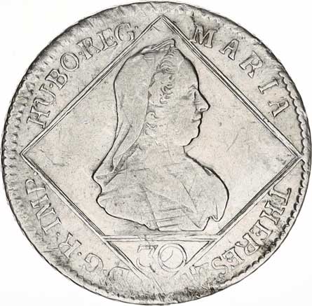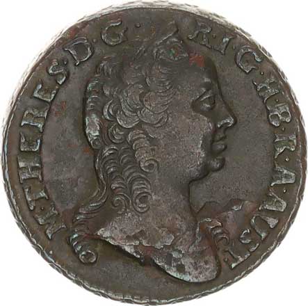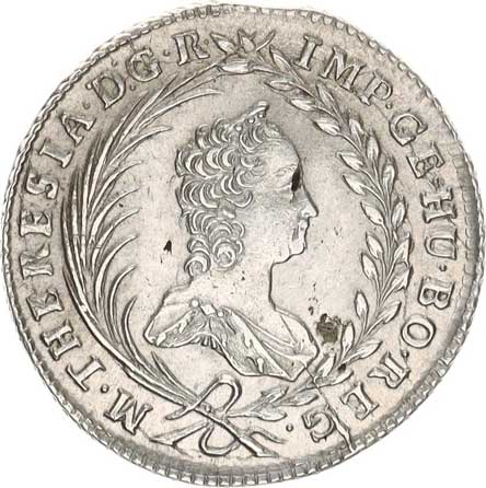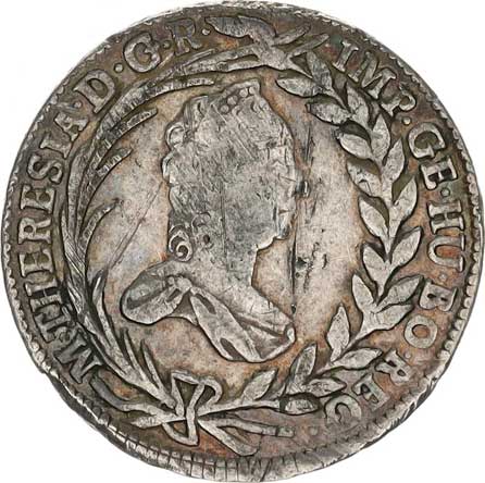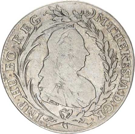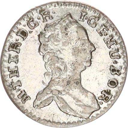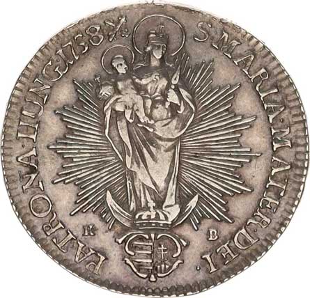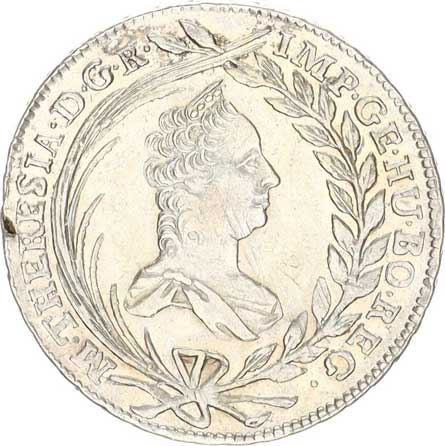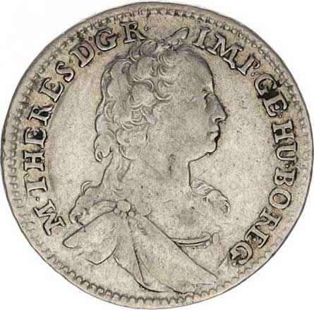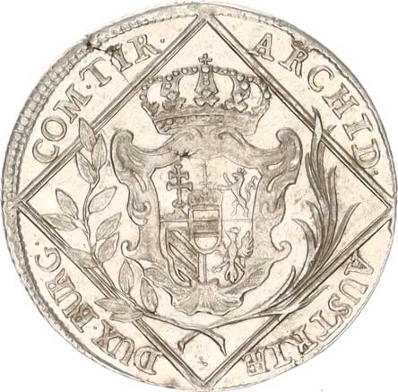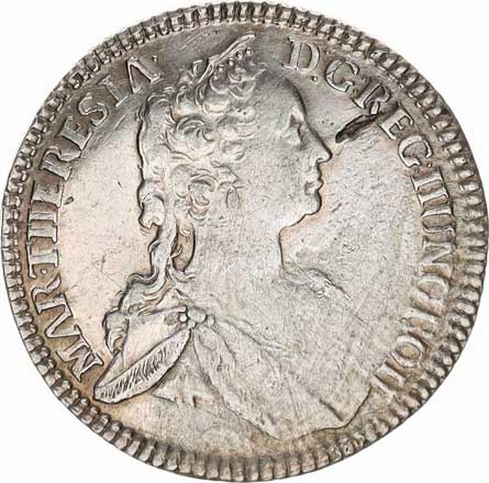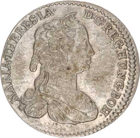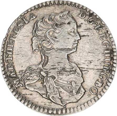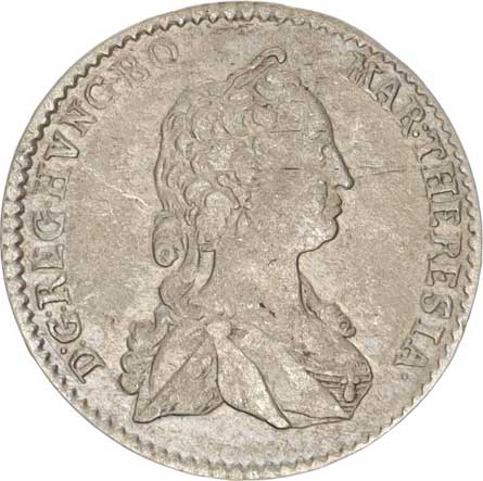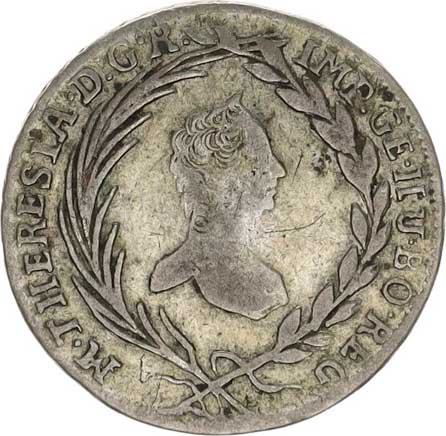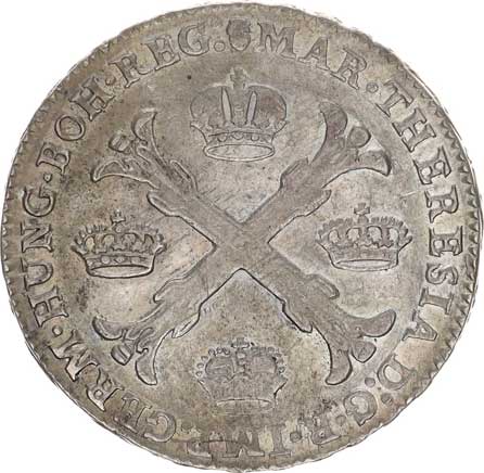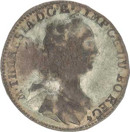 II. na trůnv r. 1780, Av: portrét M. Terezie zprava, opis / portr ét Fr. Lotrinského zprava, opis b.l. Ag 21 mm 2,681 g jako N ov. 245 "R" |
