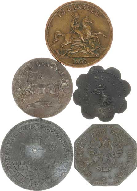 Driesen - 10 Kleingeldersatzmarke b.l., Fe Stettin - 5 Pfennig 1920 Fe Braunschweig - 10 Pfennig 1920 Fe Jäger N 3 a Hannover - Sv. Jiří / královna Viktotie Cu 5 ks |