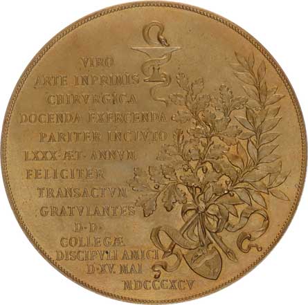 0. narozeninám 1895, poprsí zprava, nápisy / 14ti řádk. nápis, du bová a vavřín. ratolest bronz 58 mm 81,12 g |