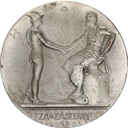 český znak, česko-něm. opis / ZA ZÁSLUHY, Alegorie zemědělství a průmyslu, česko-německý opis Ag 52 mm 45,19 g (punc. na hraně) |