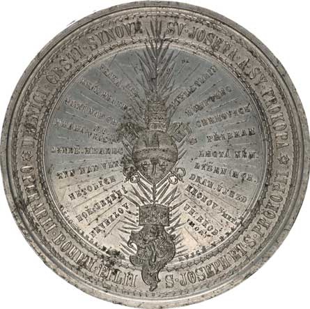 kými spolky k 50. výročí biskupského svěcení Lva XIII. a pouti če ských synů do Říma. Papež v křesle, okolo věřící, latinský opis / Uprostřed znaky, okolo seznam měst, latinsko-český opis sign.: K. Pátek Sn 80 mm 119,40 g "R" |