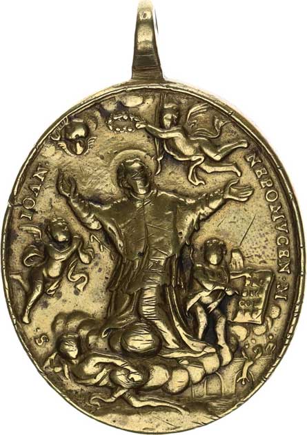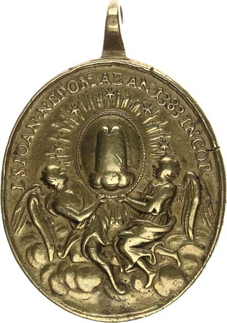 Skalce, A: Sv. Jan podle Massucciho obrazu u sv. Víta / R: Na obl acích nesou dva andělé zářící štít s vyobrazením zázračného jazyk a zlacený bronz 38x45 mm 29,198 g orig. ouško Přibil 451 |