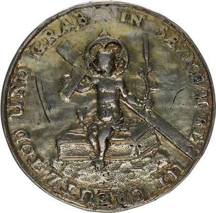 tojící Kristus s královským jablkem, kolem něj gloriola s paprsky a plamínky Ag litá 35 mm 13,088 g tém. |