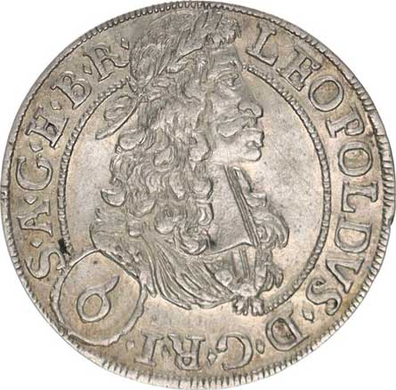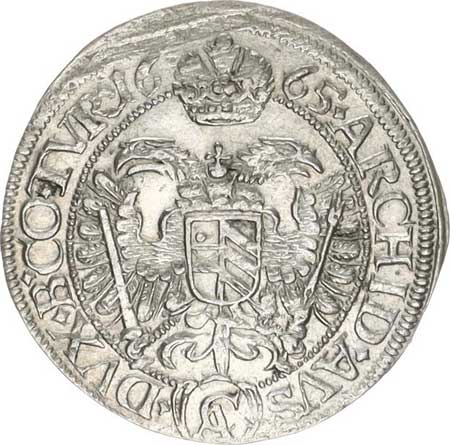 | 664. | 3 kr. 1665 SH, Štýrsko-Graz var.: nad hlavou křížek, opis: