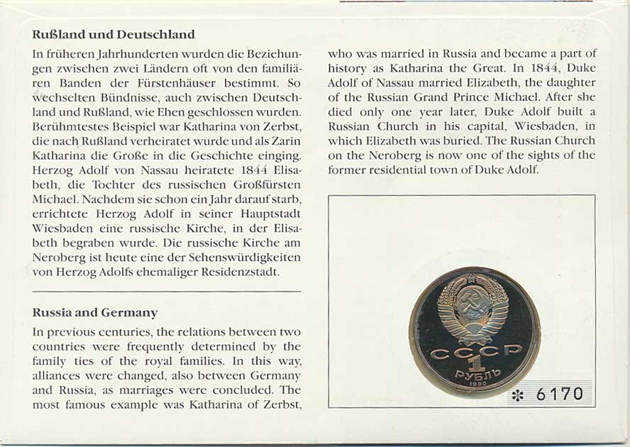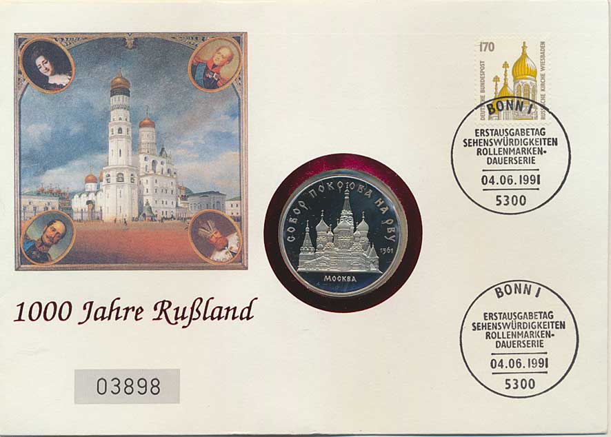 vní dopis v barevné obálce Russische Kirche in Wiesbaden, +známka 170 BRD a dvě razítka Rodenberg, Deister 8.8. 1992 obáka číslo *6170 mince Proof |