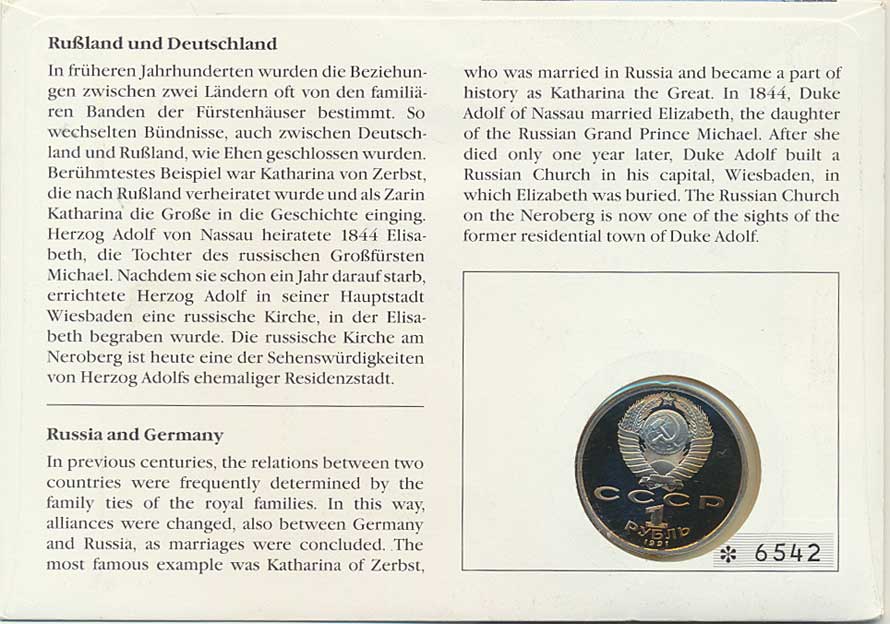 covní dopis v barevné obálce Russische Kirche in Wiesbaden, se zn ámkou 170 BRD a dvě razítka 8.8. 1992 Rodenberg, Deister číslo obálky *6542 mince Proof |