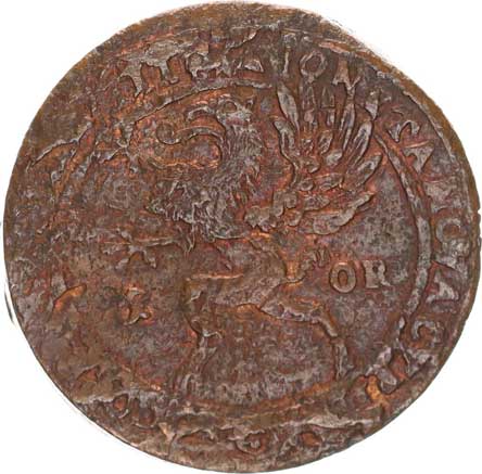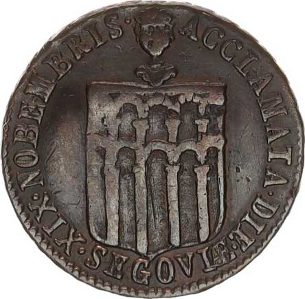 stilie, Leonu a Granady v řádu Zlatého rouna, opis s datací / Nad aquaduktem ze Segovii, čelně busta a opis Cu 23,9 mm 5,155 g minc. Segovia literatura: H. 30 "R" |