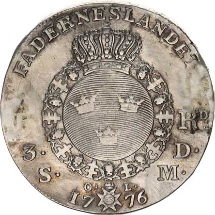 | 3973. | 1 Riksdaler 1776 OL KM 514 "R" v rv. odstr. spona | 1/1 | 2200,- | --.- |