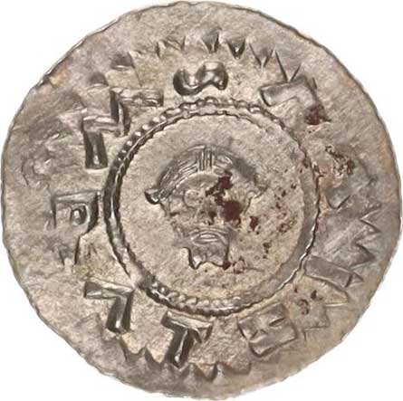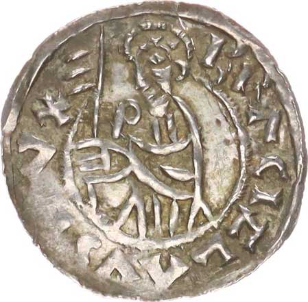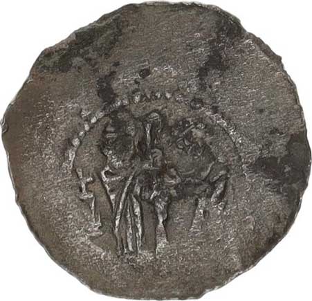 před palmovým stromem, před sebou drží prapor nález Ladná (z doby 2. křížové výpravy v letech 1147-48) PV 239 "RR " (0,342 g) nedor. |