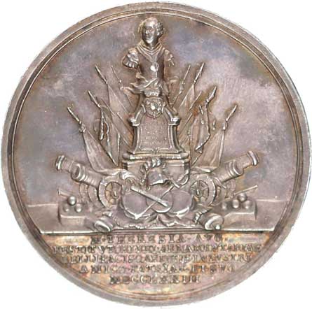 Poprsí zprava, opis / voj. atributy, 5ti řádk. nápis sign.: A. WITEMAN Ag 50 mm 43,55 g medaile M.Teresie CCLIV; Missong 170 "RR" |