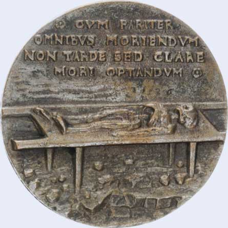 / Muž na marách a nápis „CVM PARITER OMNIBVS MORIENDVM NON TARDE SED CLARE MORI OPTANDVM 1526" patin Fe 51 mm 55,40 g +starý podložní lístek |